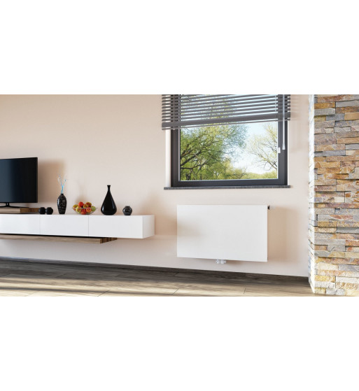 Radiator panou de top, cu suprafață plană, fabricat din tablă de oțel microaliat, ventil compact, destinat montării în instalații termice închise (sub presiune) cu posibilitate de conectare universală, în partea de jos mijloc și partea de jos dreapta.